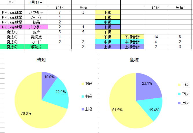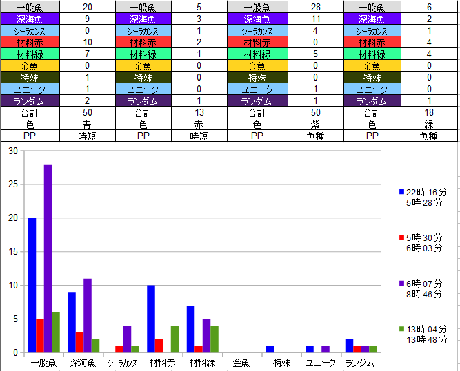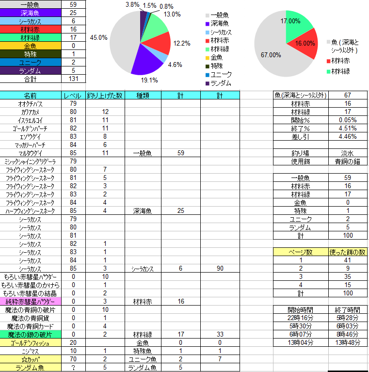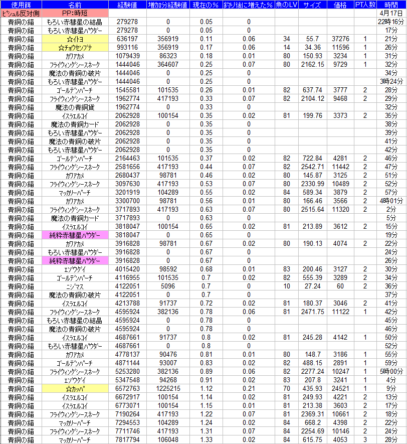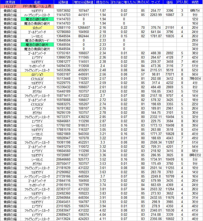 少なくとも、このデータのみだと、材料レベルが魚種PPだからと言って良くはなっていないですね。ただしサンプル数(いわゆるn)の問題かもしれませんので、なるべく条件を変えず、同様な材料比較をすれば「材料は 魚種PPだからと言って良くはならない可能性が示唆された」という結論が導かれるかもしれません」5月以降なら、統計学的協力もできます^^この際「PT人数は材料の質とは無関係」という前提でも良いかと思います 。竿、ご自身のレベル、魔法、材料あたりがそろっていてれば問題ないkぃがします。 |