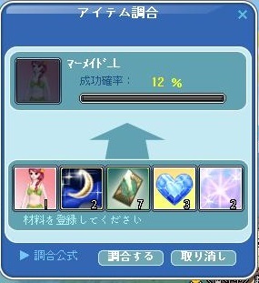 コレ!掲示板で材料を集めてたんですけどもう何週間前のイベなの?っていうくらい集まらなくて!>< そんで露店でまさかの材料を見つけてしまったので、1回分を握って!>< ヤタ───ヽ(・∀・)ノ───!! まえもって違う調合をやってミスっておいたんですけどね(;´Д`)
