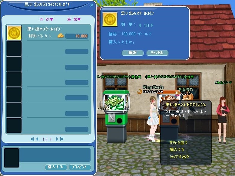 同窓会アイテムの調合は、「思い出のSCHOOLガチャ」の横にいる、