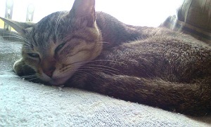 日陰の窓際で にゃんが(うちの猫ヤンです)寝てるなあ・・・