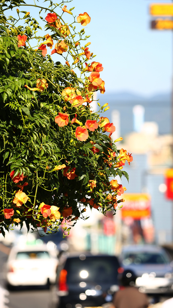 これって実は街路樹に「絡まってる」ツタ系の花なのよねー^^