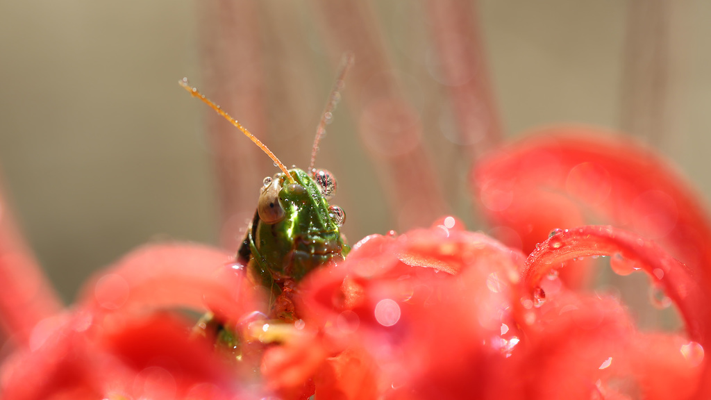 | バッタも水滴の対象に・・・(-∧-)合掌・・・ |
