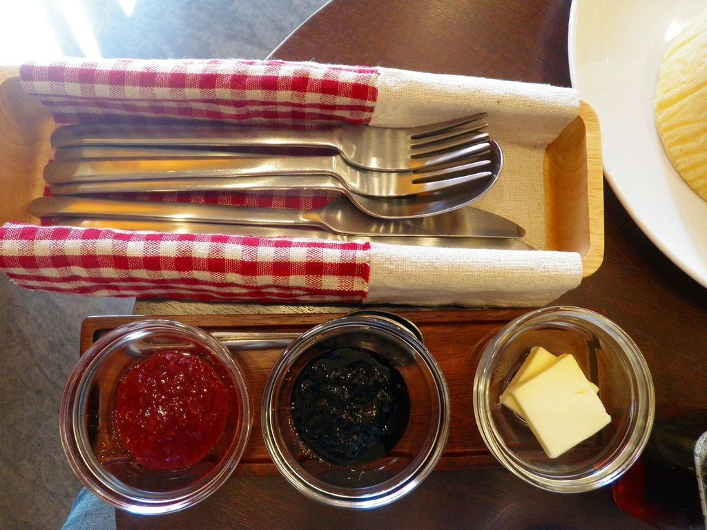 大きさの比較は、バターでご確認頂ければ良いかな?真ん中の画像右端の入れ物から「パンケーキに乗せたとこ(^^♪