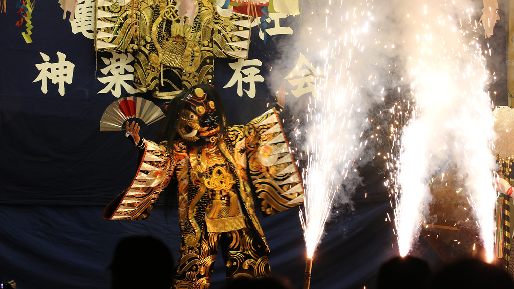 神楽団を招いて舞ってもらう場合もあれば、地元民だけでやってる場合も。