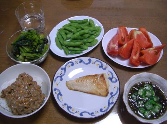 カレイのミリン漬け・もずく酢オクラのせ・わさび野沢菜・枝豆・冷やしトマト・納豆でーす