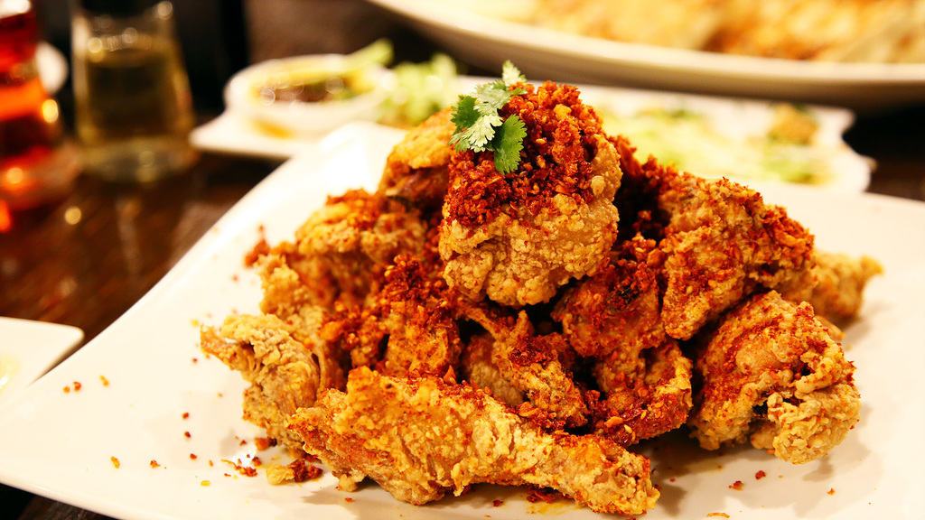 唐揚げの上にガーリックチップ?