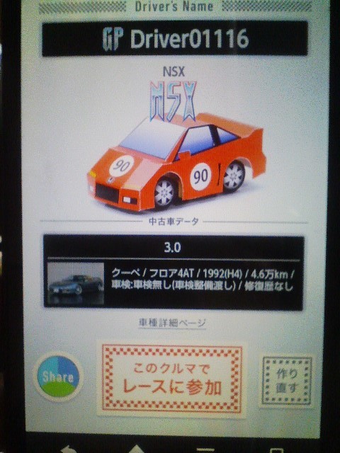 ※筆者のクルマができた。ちなみに「このクルマでレースに参加」は今押しても意味はない。会期中に押すことで,エントリーできるということだろう