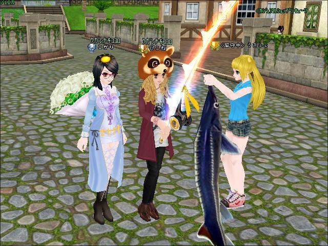 戻ってみたら、ぴこねさんは竿を入れたまま、うささんは魚をぶらさげたままお留守でした。