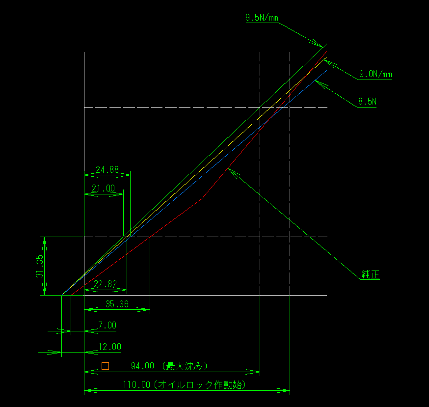 グラフを書いてみると、こんな感じで、レートを選定する時はプリロードは考慮してないので、かなり予想と結果はずれているのです。買う前は9.5N/mmで130mmの時で荷重が同じ位という想定をしていたのですがね・・・ イニシャル(セット長)が5mm違うだけで反転か・・・^^;