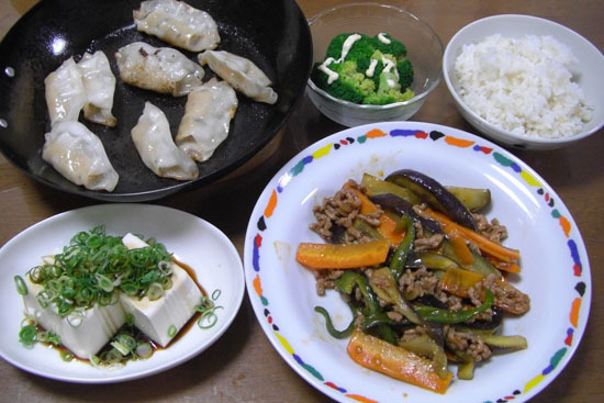 麻婆茄子・餃子・中華なのになぜか冷や奴・中華なのになぜか茹でたブロッコリー