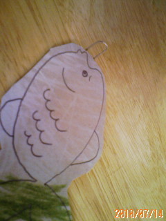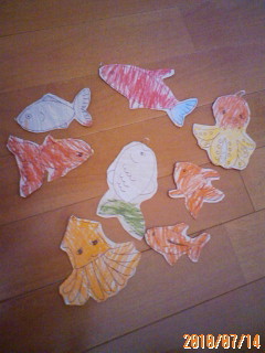 ①厚紙にボールペンで魚の絵をかく。タコやイカもいると楽しいです^^