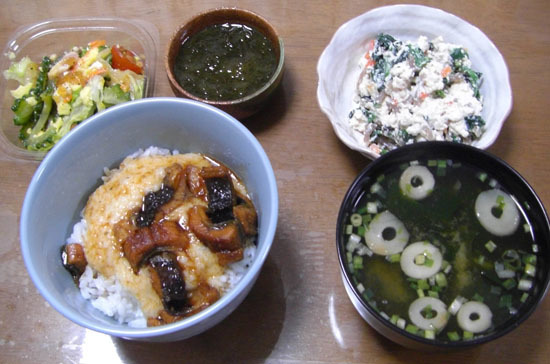 山かけ刻みウナギ丼・しらあえ・もずく酢・味噌汁・ゴーヤチャンプル風サラダ