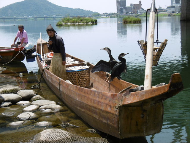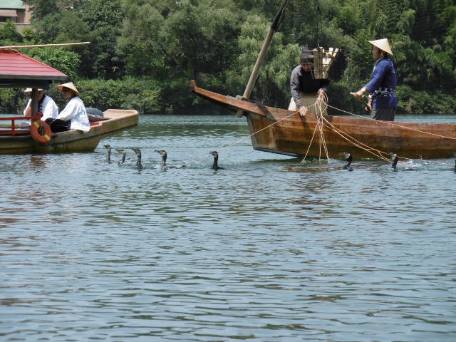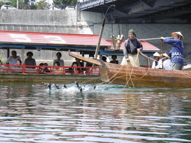 川の遊覧はメッチャ涼しい!~~~ 最高に気持ちいいー♡鵜飼本場に敬意を、地域限定 旨いわーーこれは自然の川鵜始まりました!、鵜飼 昼なので、かがり火は焚かないそうです! やっぱり?夜がいいね10ぴきの鵜を操ります???、、、、昼は魚は取れないそうです!川から見るお城は最高ですね!