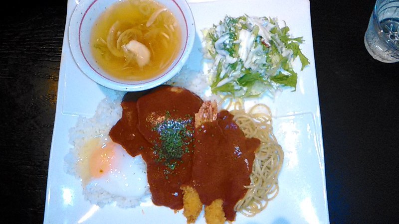 今日のランチ ・・・ 洒落たお店?で、1デッシュランチ ハンバーグと海老フライ デミグラスソース