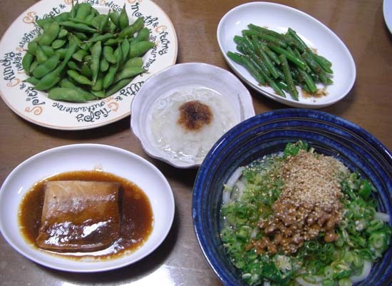 納豆おろしうどん・鯖の味噌煮(冷凍)・じゃこおろし・枝豆・サヤインゲンの炒め