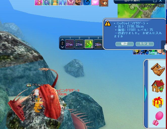 釣った時に出るウインドウの「確認」ボタンが↓の位置にくるので、ウインドウが消えた後、自動釣りアイコンをすぐクリックできて早く竿を投げることが出来ます♪