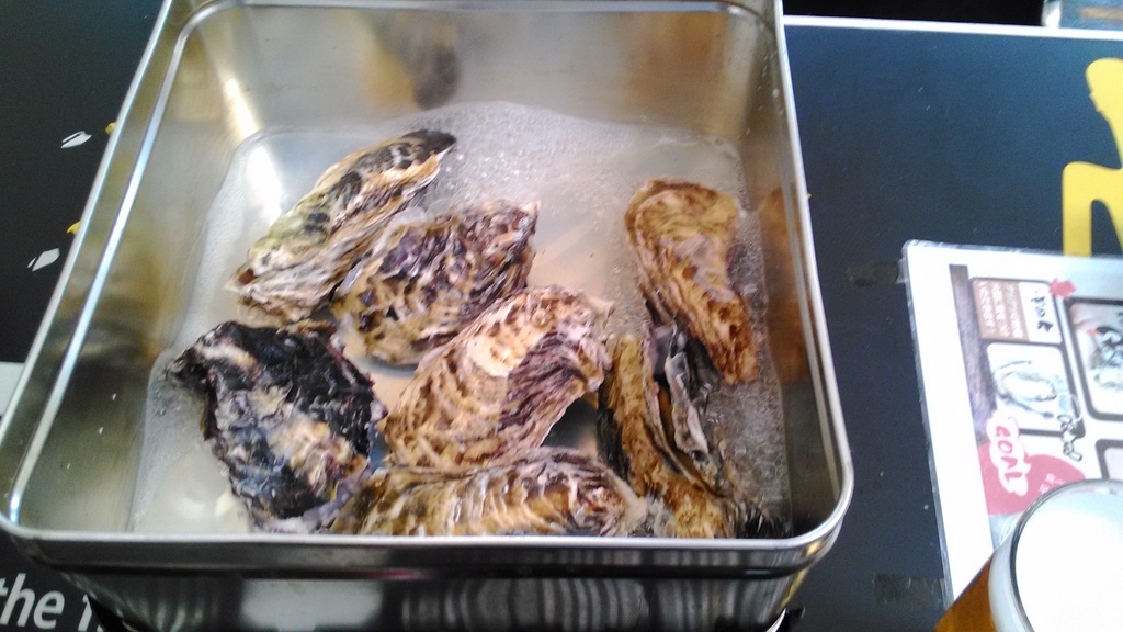 おかえりーー 今年は食べ放題!、+飲み放題? ・・・1人でビール3杯+焼酎2杯+牡蠣4缶頂きました^^ スタートは7個の蒸し牡蠣 ・・・ 10分で蒸しあがります