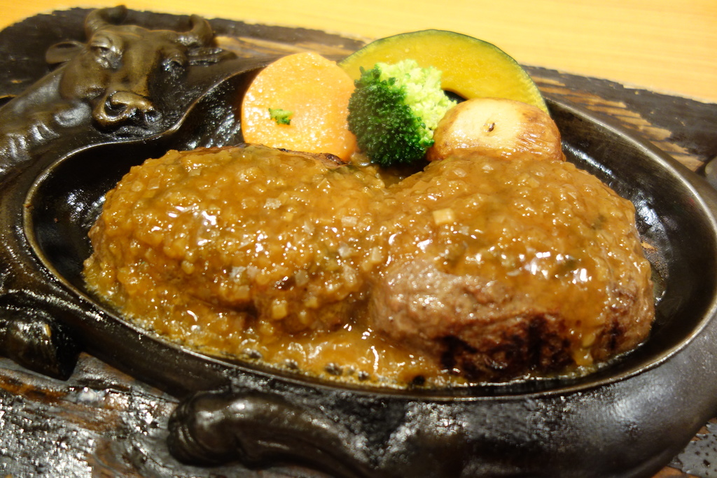 真っ二つに切ったハンバーグにソースをかけて、こうなります。