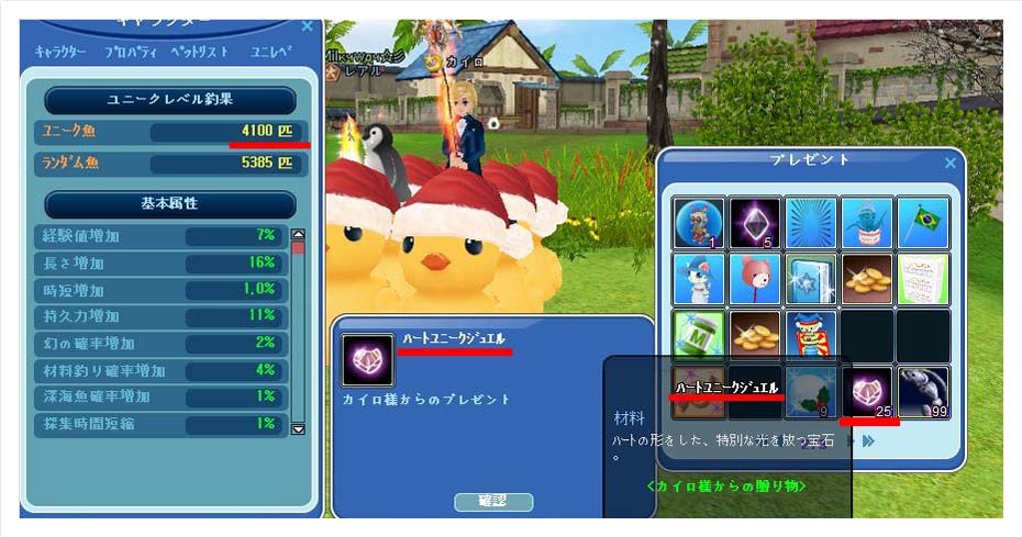 4100匹めのウニーク魚を釣り上げてご褒美にハートジュエル25こいただいちゃったカイロです