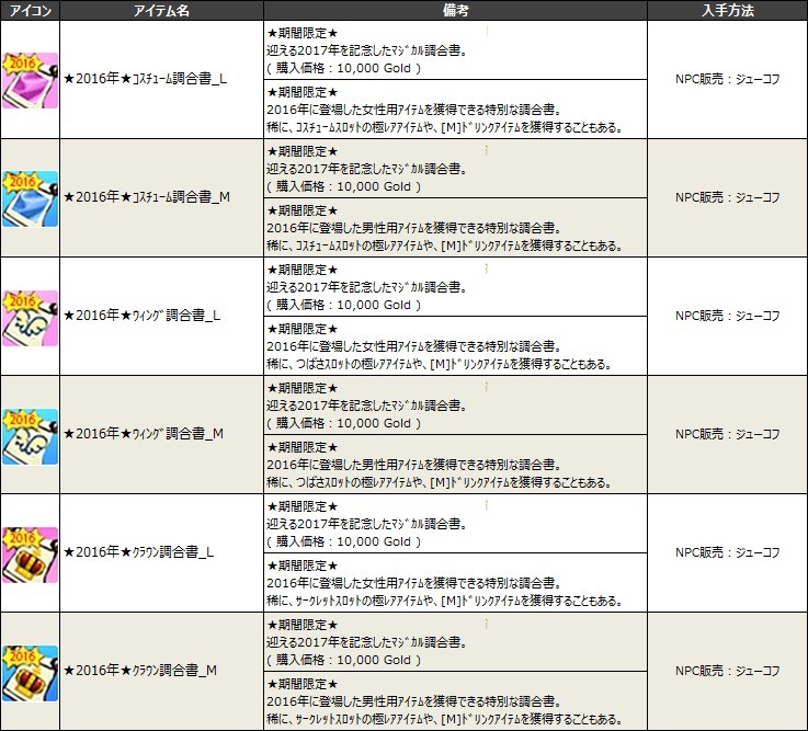 【 ★2016年★特殊アクセサリ調合書_L(M) 入手イベントアイテム例 】