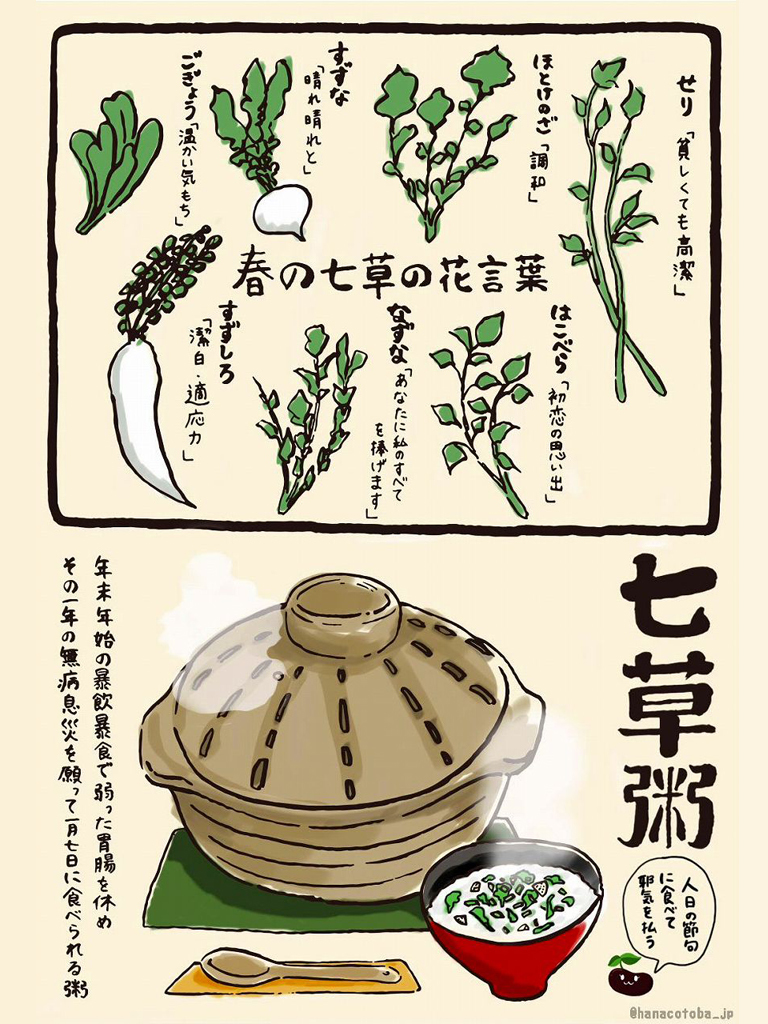 節句の風習では七日の朝、正月に食べ過ぎ疲れた胃腸を休め無病息災を願い七草がゆをいただきます