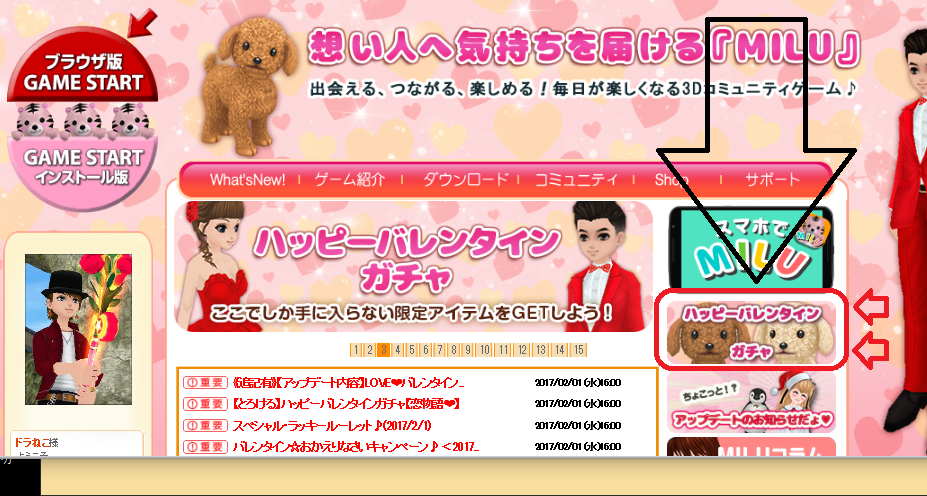 ガチャのページに公式ページから簡単に行けるとMILU友さんから教えてもらったので紹介しておきます♪