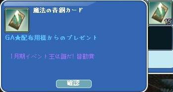 昨日のメンテ日は、朝からお出掛け~auにも寄ってきた♪アンケートに答えて、本命チョコ&鬼ちゃんファイルを頂きましたヾ(〃^∇^)ノわぁい♪↓ 緑色の箱は、74%カカオのチョコで・・いつものスーパーで購入したもの^^甘くなくても、案外美味しいものなんだね~チョコ♪これなら食べ過ぎないで済みます・・・wそして、MILUのメンテ明け☆ やっと届いてた☆1月のイベ王の皆勤賞が♪ こないね~話してたんですよっ!wイベクエは、アルパカ夫妻~始まります☆掘り終わった後のエモ・・顔は笑ってないけど・・どんだけ嬉しいんだかぁ~(ノ∀`笑))30掘りの後・・ペアタコの飴を1個掘れ☆あります!これがさ・・30掘り出して、2回目に出ちゃってて・・マイッタw夕食後にインして・・ すぐに出たよ♪(マナさんも、きっと今日・・すぐ出るよ^^)その後が・・ペアタコ5回・クエに入れてきた!お肉は、掘りキライ!・・タコ、もっとキライ!!・・(困)掘りから、相方のとこに戻ったら~シン様登場♪ 投げて頂きました!ヾ(〃^∇^)ノわぁい♪クエできたよ~~~Σd(ゝ∀・)アリガトォ♪ クエ完了☆(`・ω・´)ゞお肉さんと、いっぱいタコしてね♪って、飴まで頂いちゃった!かたじけない( *・ω・)*_ _))ペコ今日は、朝のイベ王えるので・・早寝します!土曜日は、朝から出掛けるしな・・・・きっと、月曜日には・・・・・相方とペアタコ予定なりw