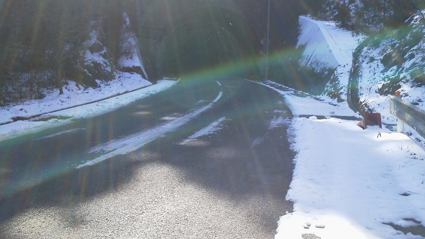 携帯なので、汚い写真ですが、まあ、これくらいなら、よく見て走ればなんとか・・・かなり注意深く見てないと、雪解けの水が道路横断してる部分は凍ってますし・・・ 真っ直ぐ入らんと怖いし、正直つまらんのですが・・・w トンネルのこれ、北側なんで、比較的積もってる方のハズなんですが、こんなもんで、大したことナイナイ^^ いけるいける!