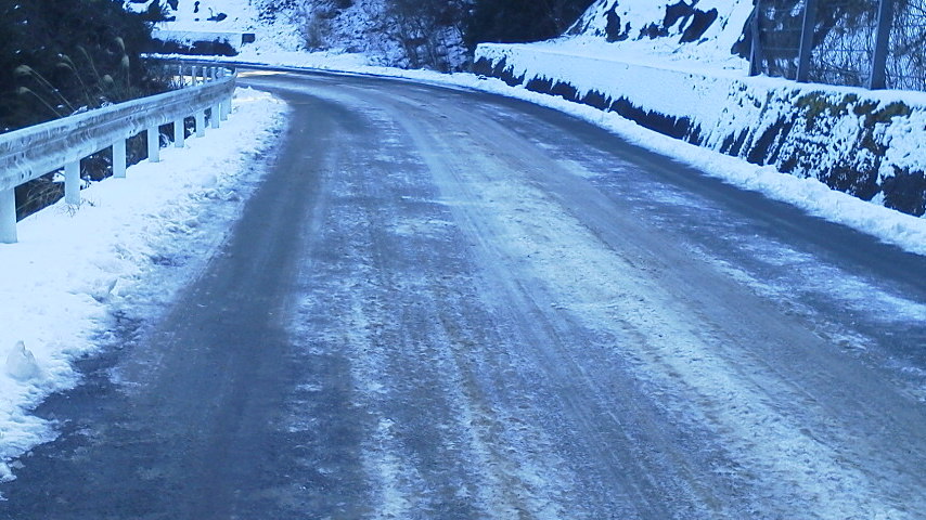 写真では見難いですが、全面氷路&圧雪路ですw 森林組合の軽トラ軽BOXはなんの躊躇もなく通ってるみたいですが・・・