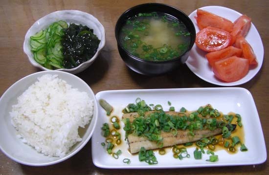 ウナギの白焼きネギポン酢わさび添え・しじみの味噌汁・わかめとキュウリの酢の物・冷やしトマト