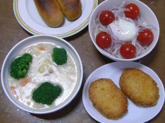 昨日の残りのシチュー・エビかつ・温玉のせオニオンサラダ・パンでした