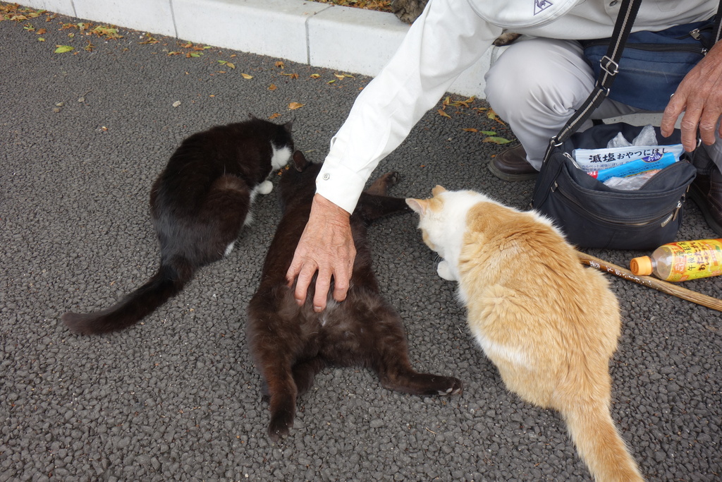 道端でドラネコに遭遇し、猫マスターの登場で周囲にいた複数のドラネコが集結して猫まみれ状態に。猫マスターも猫のツボを心得ているようで、全員骨抜きにされてました^^