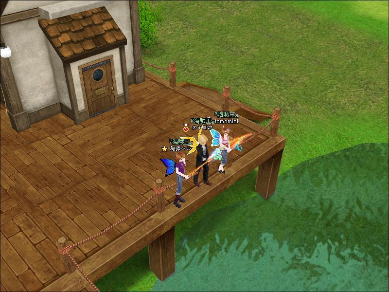 デッキのロープの外で釣りをしました^^