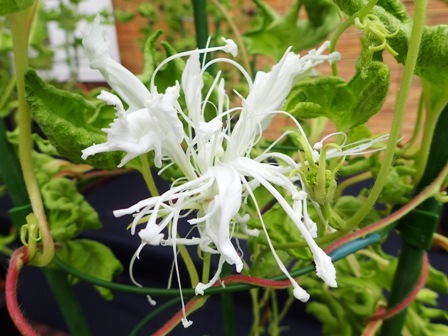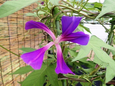 切っちゃったわけじゃなくて、これが咲きます 朝顔は江戸時代から品種改良が進んで いろいろな花があるそうです ところで、ここでクイズです 朝顔と同じような花が咲くものはどれでしょう 1 さといも 2 さつまいも 3 じゃがいも 正解はあしたww そんないちにち