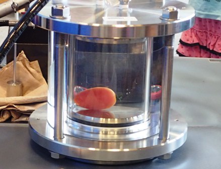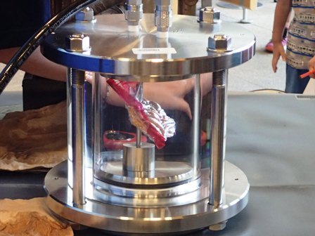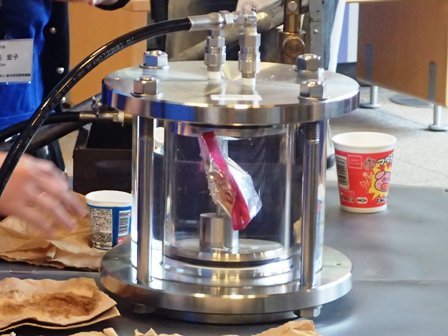 土曜日はJAMSTEC横浜研究所の一般公開日 水圧実験をやっていました よくある実験ですが 発泡スチロールのカップに水圧をかけると