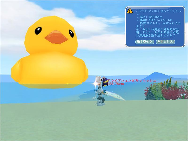 海岸に浮かぶアヒルの前で アラビアンエンジェルフィッシュを釣り上げて
