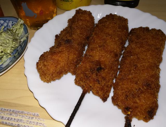 ① 串カツ揚げx2 ② なぞ揚げ ③ マヨワカメサラダ