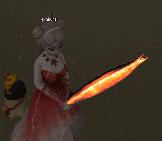 | 赤く燃えて口パクパク、歯が見える! |