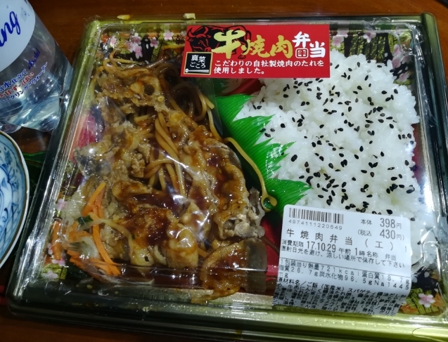 ① 牛焼き肉弁当 ② 茎ワカメサラダ ③ スパークリング微カルピス割り