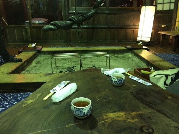 囲炉裏の傍の座敷席をゲットして、料理が来るのを待ちます。