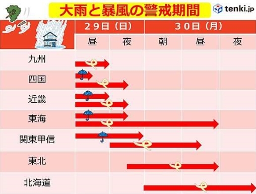 きょう29日(日)、台風22号はスピードアップして本州南岸を東進。九州から関東は非常に強い風が吹き、滝のような雨の降る所も。東北は今夜から、北海道もあす30日(月)は暴風が吹き荒れるでしょう。
