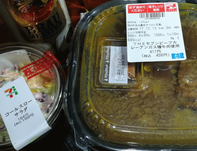 ① THEセブンビーフカレーロヒンギャ種牛肉使用 ② コールスローサラダ