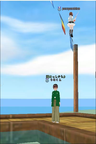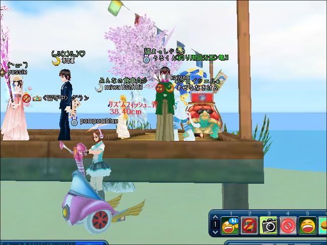 ポムさん。パンツ丸見えで釣りをするの図w今日は場所がよかったので南の桟橋で釣りしました。ギルメンのさあやさんにもようやく会えてよかったです。。MILUで初めてお友達になったノアンさんとも会いました(''◇'')ゞイベント残り100!!がんばろう(#^^#)