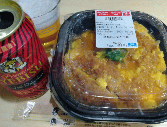 ① 特製ロースかつ丼 ② YEBISU 格別の乾杯