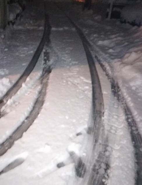 まだ外暗い朝ほどに雪の中お出かけし帰ってきて見たタイヤ痕…
