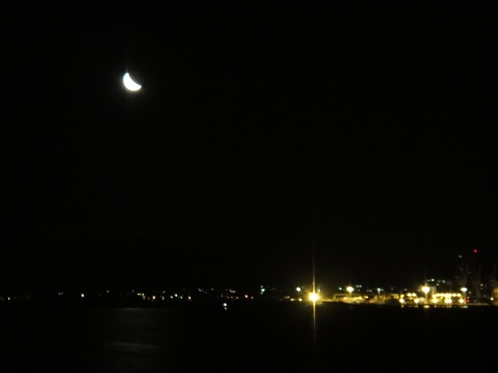 街明かりより上は山、下は海で、ちょうど山から月が昇ったところでした