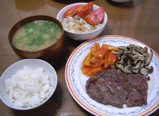 ステーキ・付け合わせにトマトとキノコのソテー・サラダ・なめことタマネギの味噌汁・ご飯でした