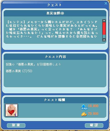 頑張って1時間摘みましたが、残念ながら善悪の果実50個はでず、果実依頼④の途中で止まりましたw