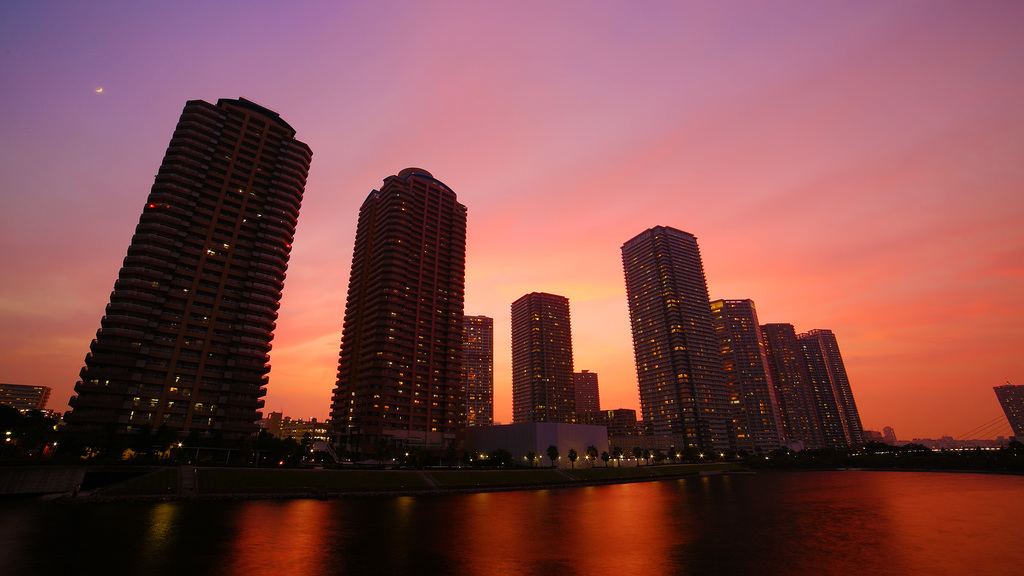 夏至の直近で高層マンションの各家庭の明かりの多くが消えてる
