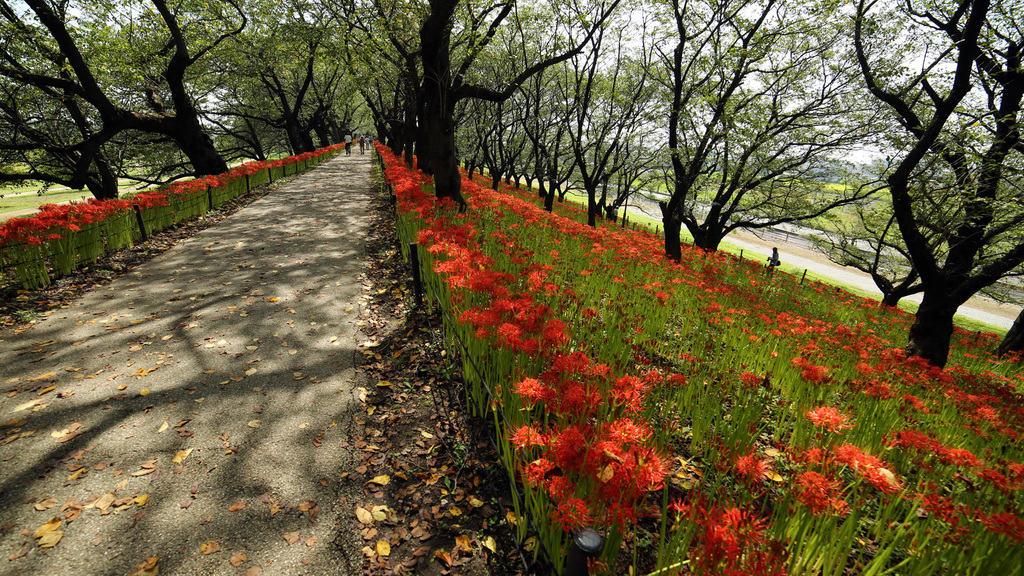 土手沿いの斜面がびっしりと彼岸花で埋め尽くされています。